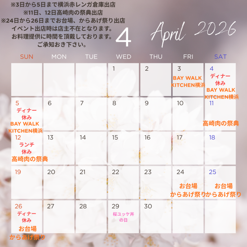 お知らせ 4月のスケジュール 2026年4月4日 by なる花おかみ こんにちは🙌食匠なる花🌸です 4月の営業カレンダー🗓️となります!週末のお休みがあり変則的になっておりますのでご来店の際はご注意下さい🙇♀️